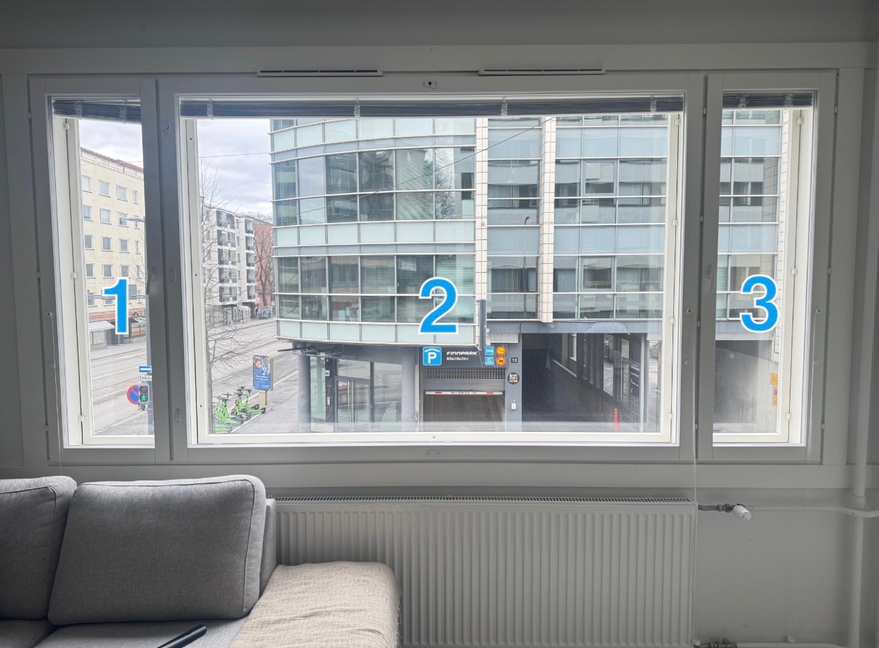 Pesemme ikkunat aina molemmilta puolilta! Pyyhimme myös pellit sekä sälekaihtimet.
